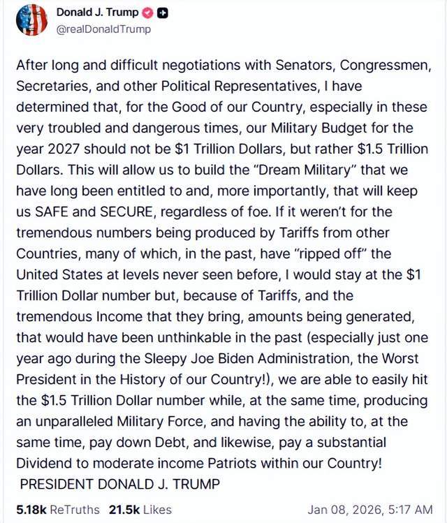 川普提2027年国防预算暴增至1.5兆 打造“梦幻军队”