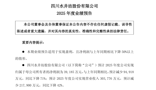头部酒企水井坊预计净利下滑71% 创2018年来新低