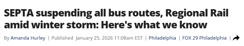 SEPTA停运所有公交线路及区域铁路服务