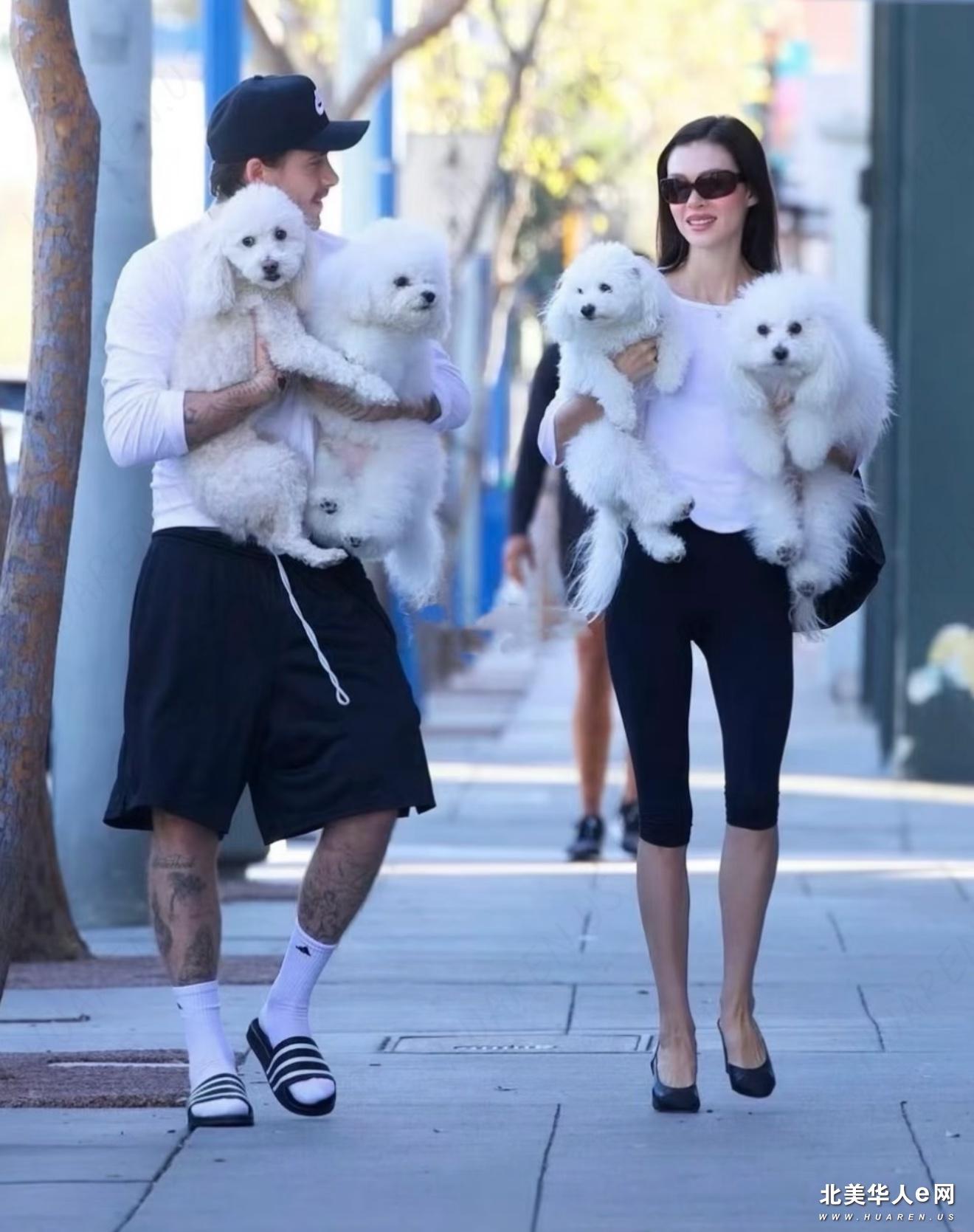 贝克汉姆大儿子和老婆抱狗上街很甜蜜