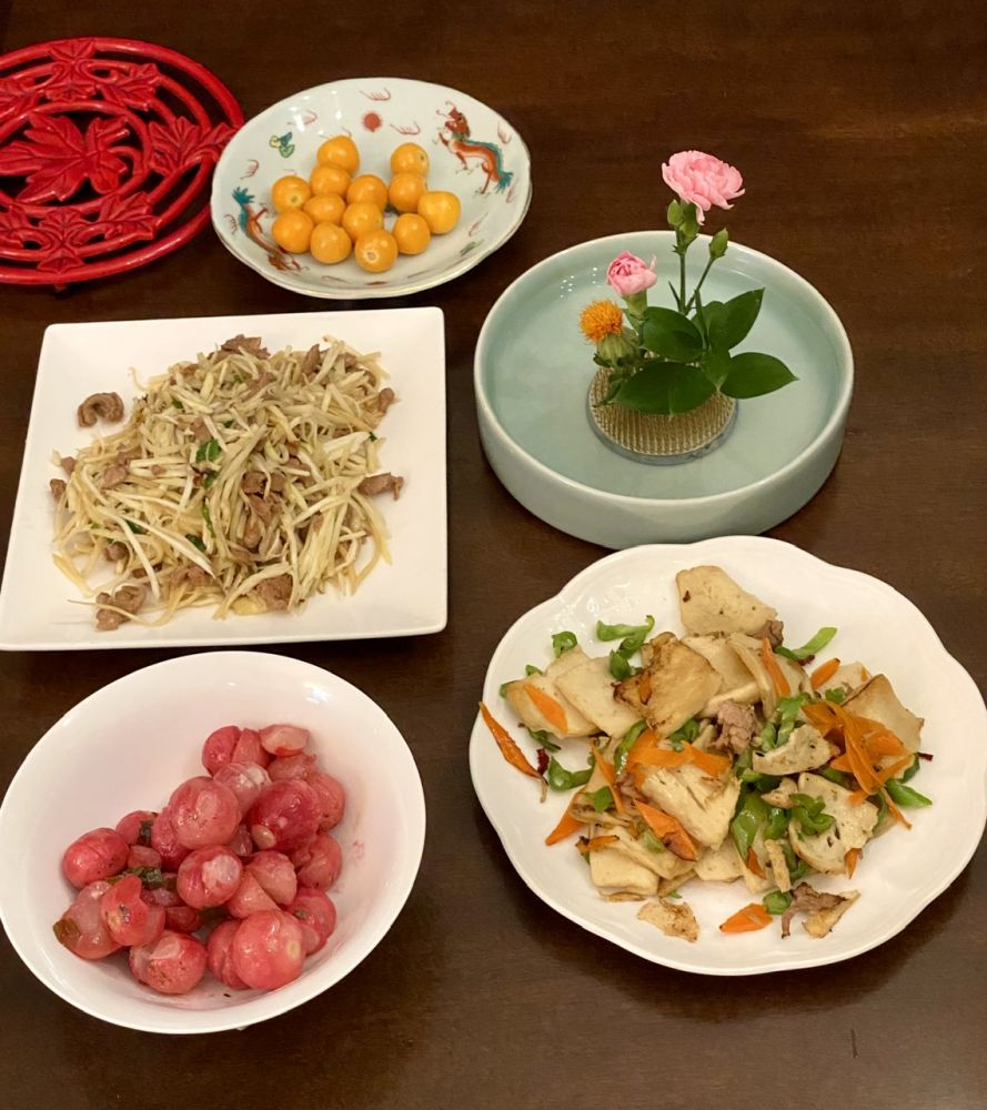 玫瑰切糕,茭白肉丝,胭脂萝卜,千页豆腐