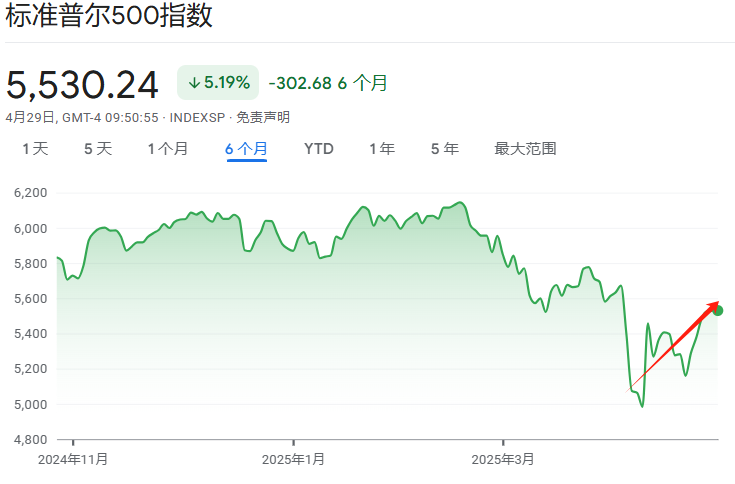 截止当地时间周一,标普500指数已经连续五个交易日上涨,这是自去年11月以来的最长连涨纪录。自4月低点以来,该指数累计反弹了10%。衡量股市波动性保护需求的Cboe波动性指数(VIX)目前为25,远低于4月7日约60的高点。