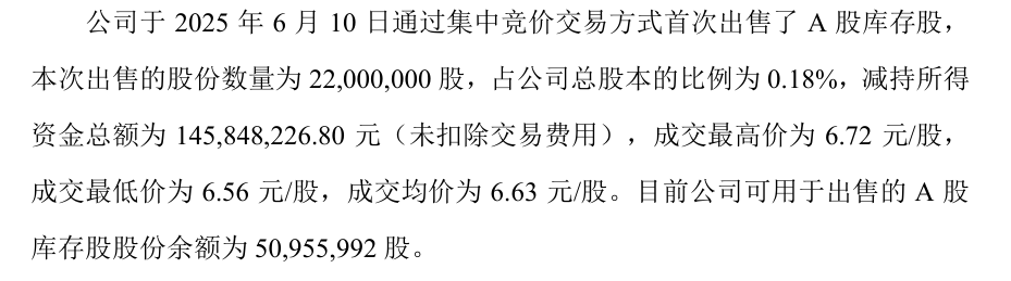 万科6月11日发布公告表示,本次出售的股份数量为2200万股,占公司总股本的比例为0.18%;成交最高价为6.72元/股,最低价为6.56元/股,成交均价为6.63元/股,减持所得资金总额为1.46亿元(未扣除交易费用),出售期间为2025年6月10日至6月12日。