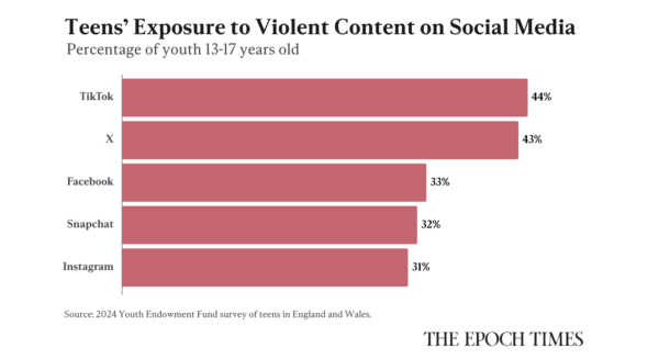 根据2024年青年捐赠基金(2024 Youth Endowment Fund)对英格兰和威尔士青少年所作的调查,在13至17岁青少年当中,约有70%在社交媒体上目睹过现实世界的暴力。在过去12个月中,TikTok用户接触暴力内容的比例最高,为44%。紧随其后的是X平台用户,占比43%。不过,只有不到四分之一的受访者表示使用过X平台。Facebook、Snapchat和Instagram等社媒平台情况也不容乐观,青少年用户接触暴力内容的比例达到31%至33%。