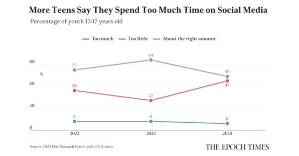 总部位于华盛顿特区的皮尤研究中心(Pew Research Center)开展的一项名为“关于青少年与社交媒体的10个事实”(10 facts about teens and social media,07/10/2025)的民意调查显示,近一半的青少年承认,他们在社交媒体上花费了太多时间,而在2023年,只有约四分之一的青少年表达了这样的看法。