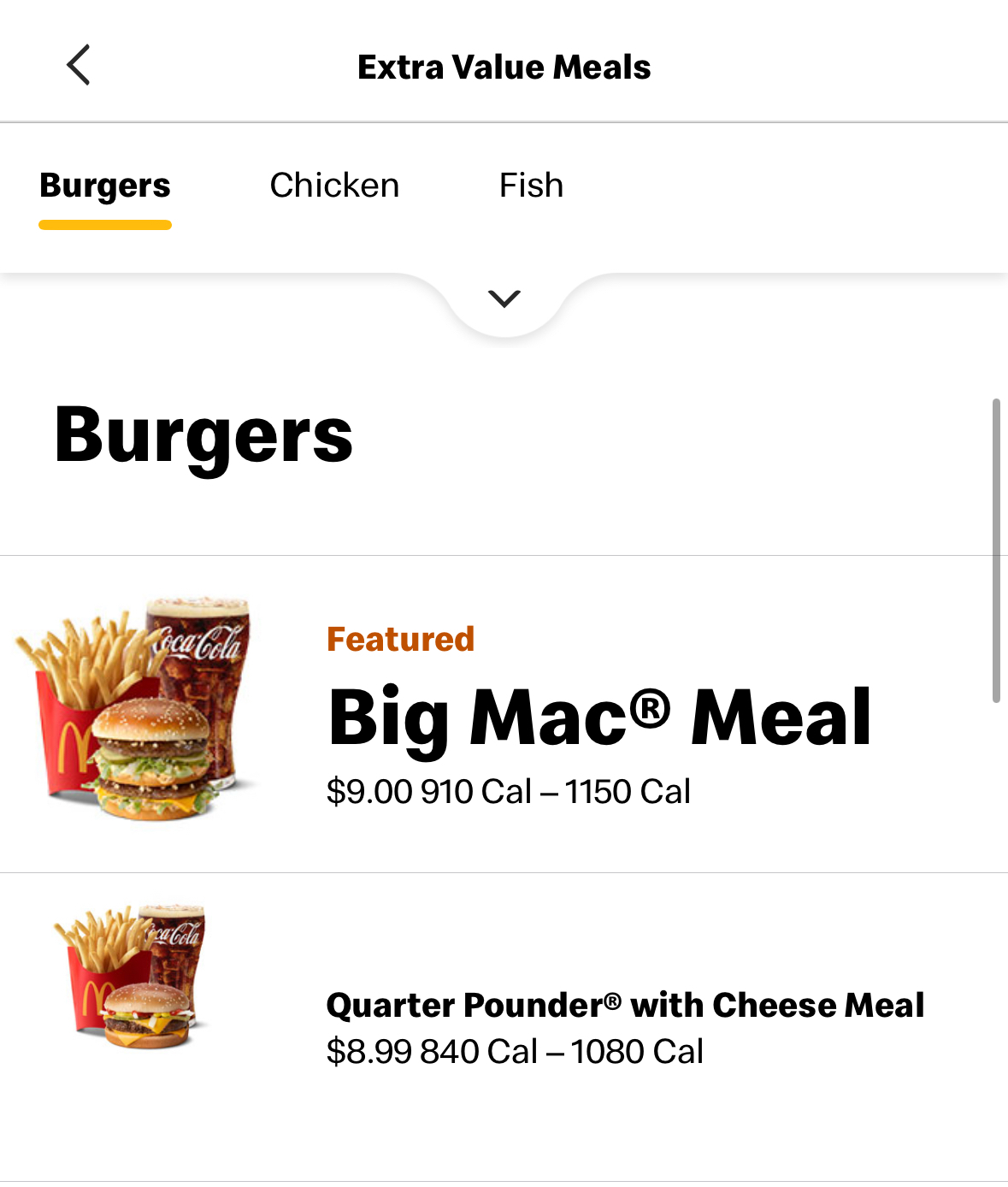 麦当劳“超值套餐”包括多种选择,经典的巨无霸套餐售价仅9美元。(截图自麦当劳APP)