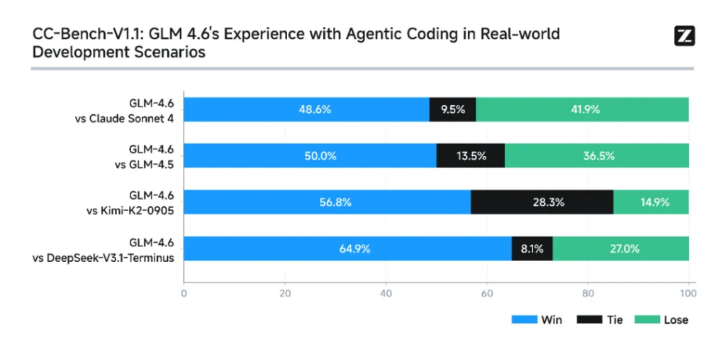 为了测试模型在实际编程任务中的能力,我们在Claude Code环境下进行了74个真实场景编程任务测试。结果显示,GLM-4.6实测超过Claude Sonnet 4,超越其他国产模型。