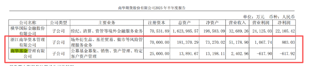 从南华期货公布的2025年半年报可以发现,上半年,南华基金的营业收入只有2400万,尚不足各项支出的总额,所以导致,南华基金反而亏损了618万。