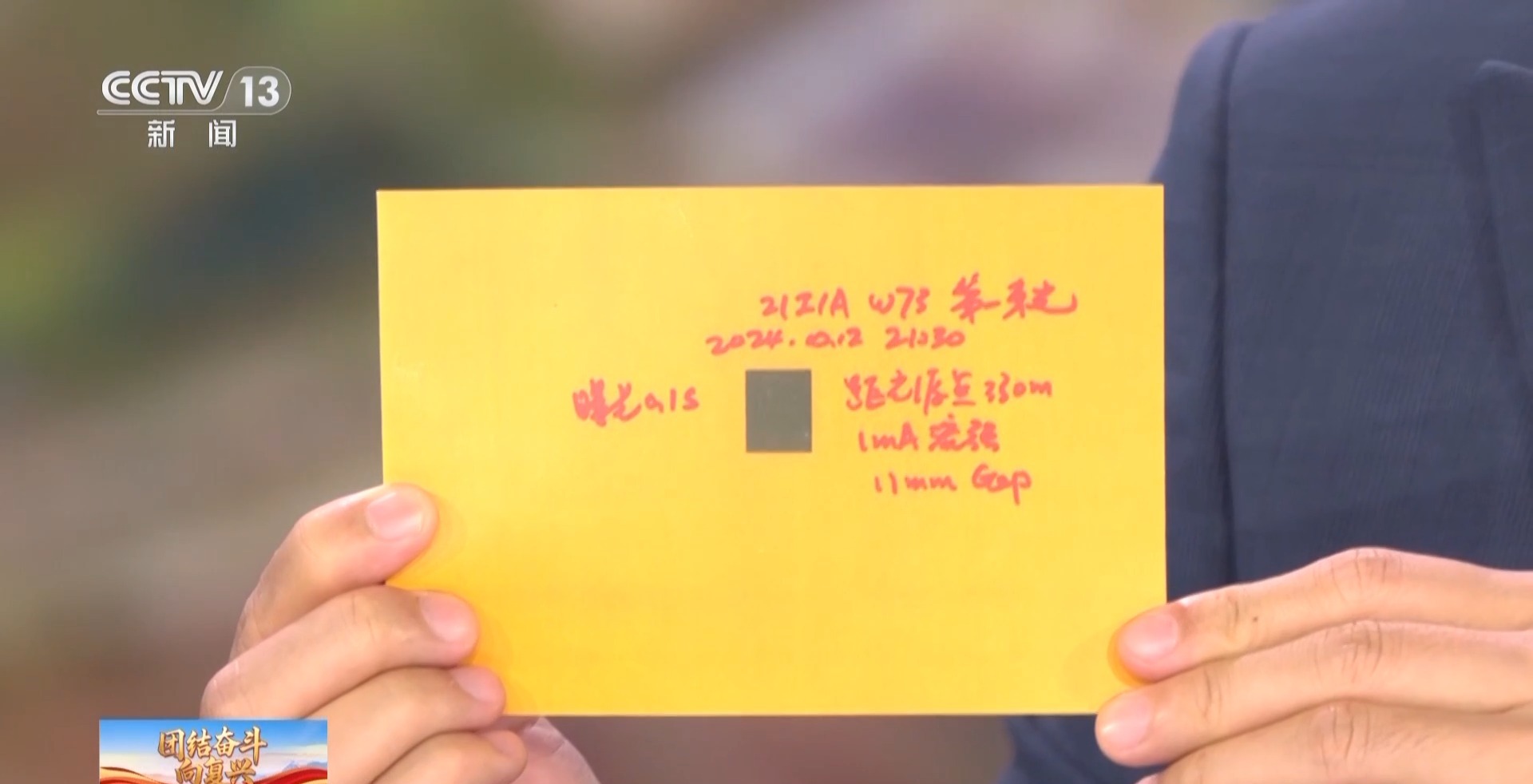 高能同步辐射光源第一次发出光时,科研人员用一张黄色感光纸放在光路上,记录下的一个黑色斑点。上面手写记录了2024年10月12日21时30分,第一束光等内容。这个黑色方形斑点就是高能同步辐射光源发出第一束光的标志。