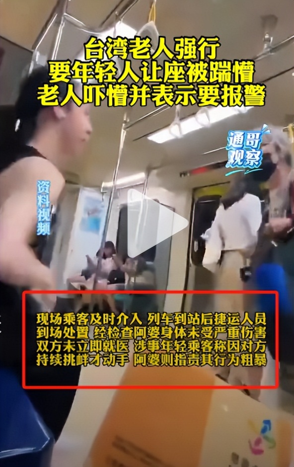 昨日台湾地铁上,一位老人强行要求年轻人让座,结果碰到“硬茬子”,被年轻人一脚踹飞。