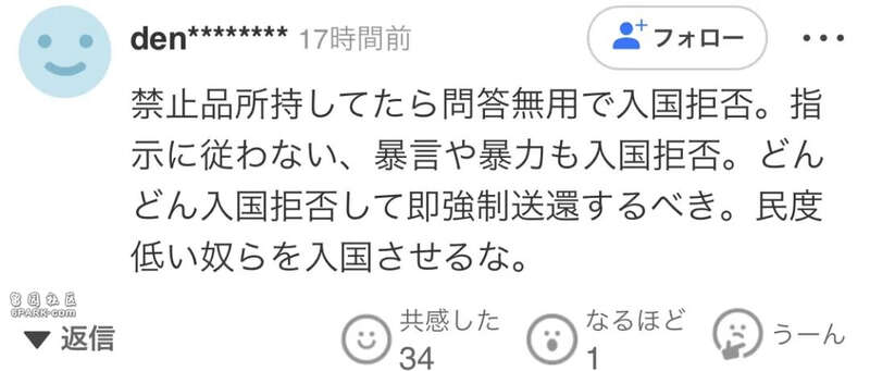 “如果携带违禁品就一律拒绝入境。不服从指示、口出恶言或施暴的也要拒绝入境。应该不断拒绝入境并立即强制遣返。别让那些素质低下的人进来。”