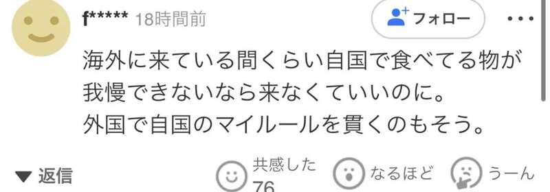 “既然都出国了,那还吃什么在本国常吃的东西,受不了干脆别来。在外国还要坚持本国的我行我素,无法理解。”
