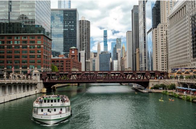 这张摄于2025年8月25日的照片中,可以看到一艘观光船在位于美国芝加哥的芝加哥河(Chicago River)行驶。(Reuters)