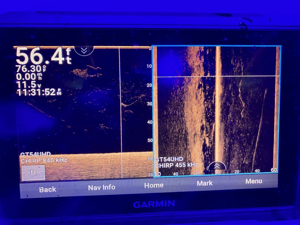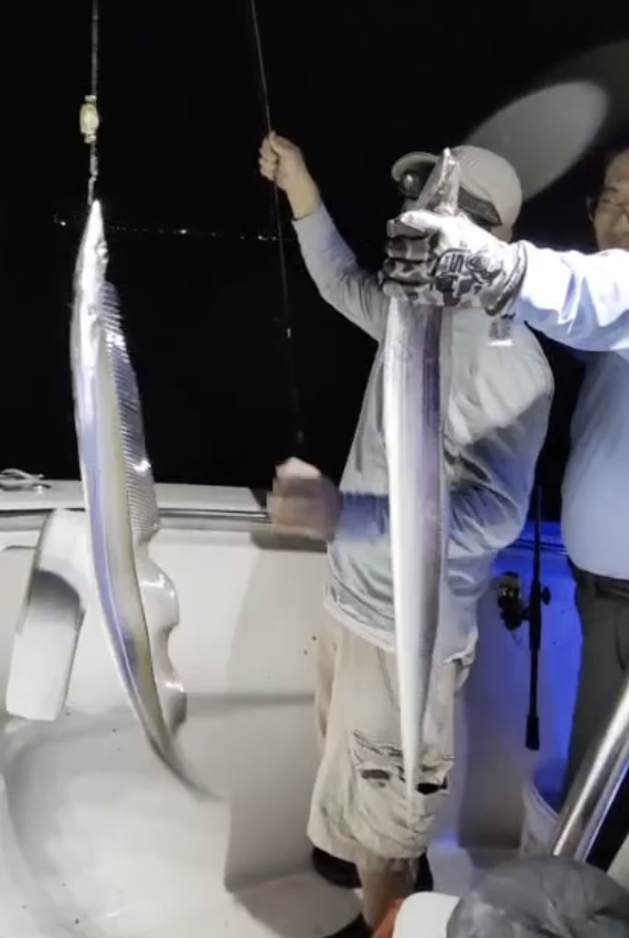 为了改善渔情,老渔民他们把带来的大灯架在船上,倒是吸引了不少小鱼,一段时间后时不时带鱼也多了些。阿海倒是船钓老手,一边控制着船,一方面用探鱼器声纳成像及时报告鱼群位置,包括鱼所处的水层深度和具体方位,指挥众人下竿,配合得相当默契,有的放矢,准确下杆,效率也提高不少。阿森和阿木是船钓老手,钓组用得简单,钢丝前导线穿上大嘴鲈鱼钩再加蛋形空心铅坠,先用绿胖子和老渔民带的针头鱼切块做饵,后来用现片的新鲜带鱼肉作饵,而且阿森即使在咬口少时,还时不时用路亚上鱼,功夫了得。由于他们上鱼最多,被大伙夸为“劳模”。鱼多时大伙忙不过来,有时双飞,有时三飞,甚至有时四人同时中鱼,忙得手忙脚乱,场面很热闹。六哥是第一次钓带鱼,用的是碳线和high-low的沉底钓组,挂双饵,虽然效率不高,但也时不时上鱼,兴奋不已。老渔民手气倒不错,咬口也不少,但可惜用的天亚钩频频被大带鱼断线拖走,估计一晚上有一半的时间在绑钓组,上鱼居然不是很多。