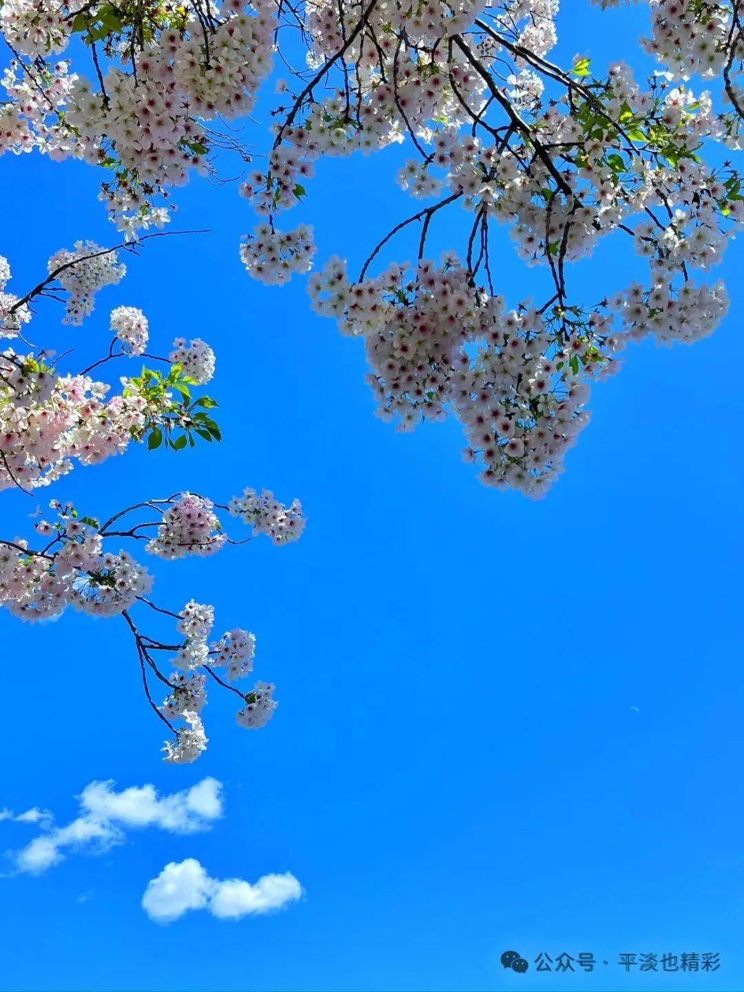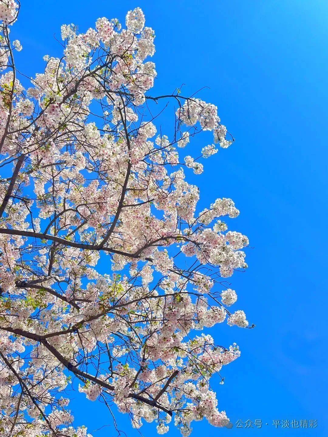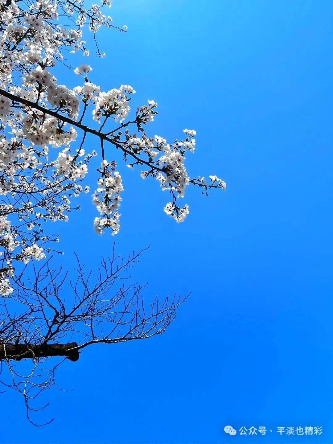 樱花大道的道路两旁,一棵棵的樱花树,枝繁花满,犹如一把把绚丽无比的大花伞,支撑着满树的繁花。碧日晴空下,樱花烂漫,白中透粉,美若云霞。虽然此时游人如织,络绎不绝,摩肩擦踵的,但漫步在樱花大道上,如赴一场樱花盛宴般,远观近赏,极饱眼福,给人一种难以言喻的美妙感觉。此时还会不由自主得幻想着,如果行人稀少时,这如诗画般的樱花道,定是另有一番意境;漫步其间,更会别有一番心情吧!