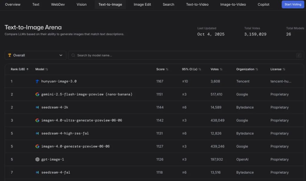 在国际权威 AI 模型评测榜单 LMArena 上,HunyuanImage 3.0 一举超越了谷歌风头无两的 Nano-Banana 以及字节的 Seedream 4.0,位列文生图(Text-to-Image)综合榜单和开源榜单第一。