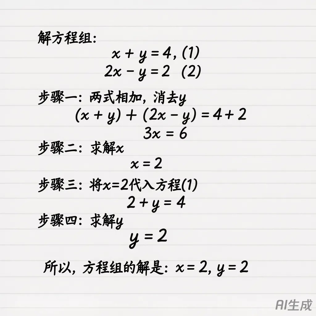 提示语:解方程组 x+y=4 ,2x-y=2,给出详细求解过程。