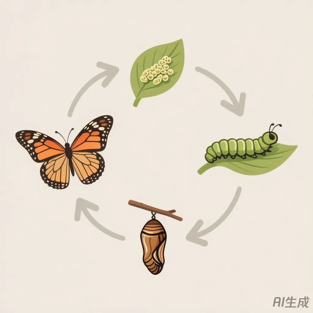 而当我们进一步输入提示“用循环箭头的形式解释破茧成蝶”,混元图像 3.0 又能切换到创意表达模式:它将自然的蜕变过程拆解成多个阶段。