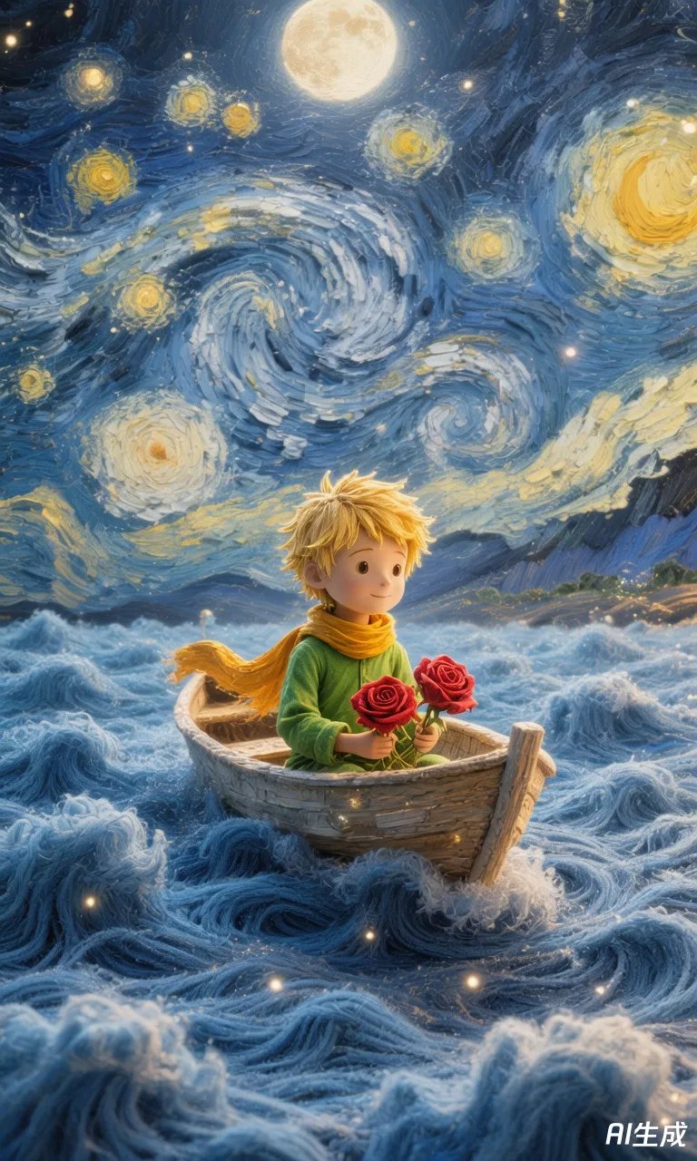 再来一个提示语“画面中心是一个金发小男孩,穿着绿色衣服,系着黄色围巾,坐在一条小船里,怀抱着两朵红玫瑰。小船漂浮在波浪般的蓝色海面上,海浪像是绒毛或艺术质感般细腻。背景是一片星空,带有梵高《星空》的旋转星云与明亮月亮。画面中点缀着闪烁的光点,营造温暖、浪漫和童话般的氛围。”