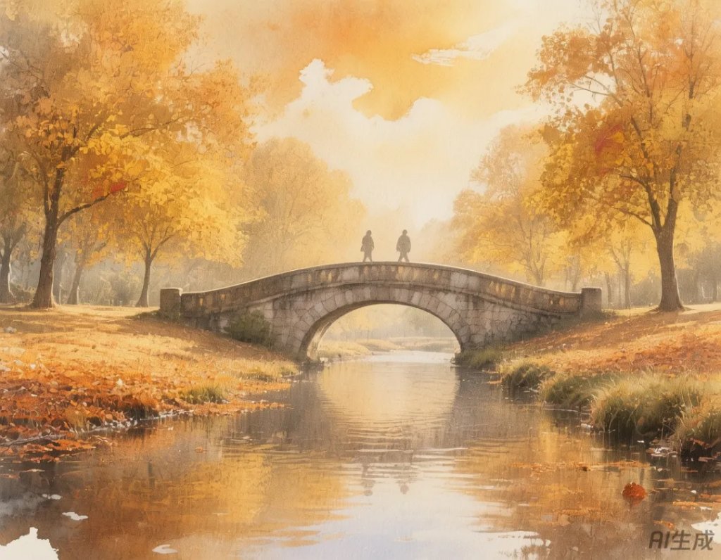提示语:水彩画风格,全景视角。画面中有石桥、河流、人物、树木与天空,色调以秋日的金黄与暖橙为主,笔触细腻而略带朦胧,呈现出写意的艺术质感。整体氛围宁静悠然,展现公园秋日的自然景致与人文活动交织的美感,充满诗意与生活气息。
