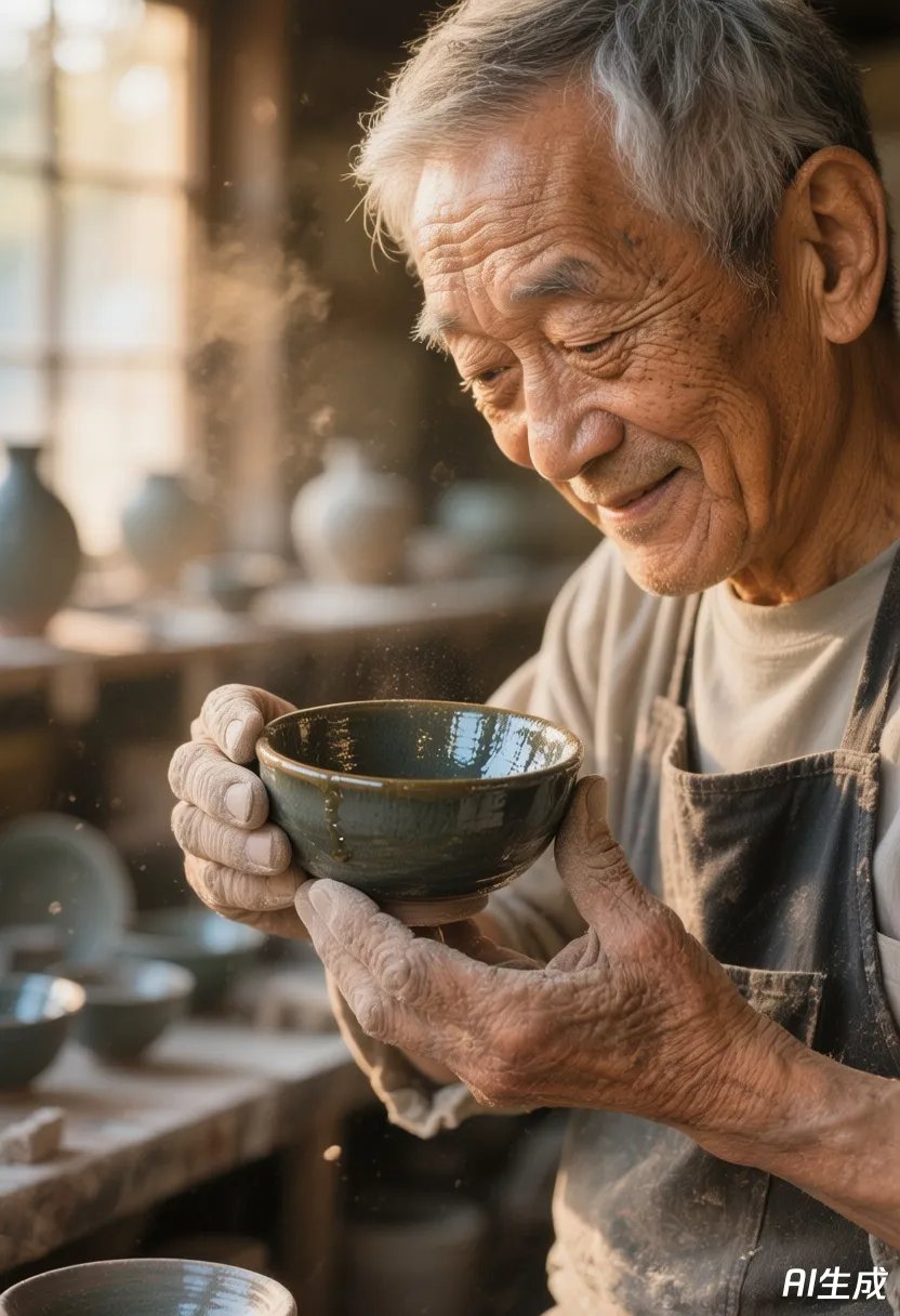 “A photorealistic close-up portrait of an elderly Japanese ceramicist with deep, sun-etched wrinkles and a warm, knowing smile. He is carefully inspecting a freshly glazed tea bowl. The setting is his rustic, sun-drenched workshop. The scene is illuminated by soft, golden hour light streaming through a window, highlighting the fine texture of the clay. Captured with an 85mm portrait lens, resulting in a soft, blurred background (bokeh). The overall mood is serene and masterful. Vertical portrait orientation.”