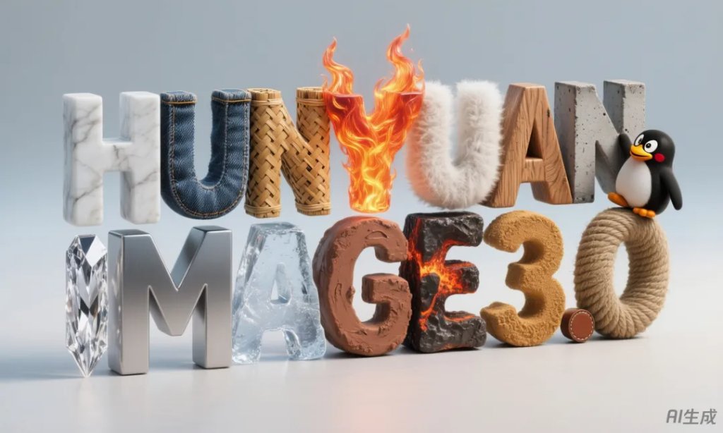 混元图像 3.0 还具有很高的文字渲染能力。例如,当我们输入提示语:创建一个高分辨率的文字 3D 渲染图,第一行文字是 "HUNYUAN",第二行文字是 "IMAGE 3.0",每个字母使用不同的材质进行渲染,材质可以是 sisal、亚麻绳、竹编、草棉花、牛仔布、沙子、木头、皮革、粘土、大理石、羊毛金属、火山熔岩、冰块、火焰、水泥、钻石等。旁边陶瓷、一只很矮的 Tencent QQ 企鹅正扶着文字,仿佛这些文字都是它拼的。 将其放置在干净简约的浅灰色背景上。