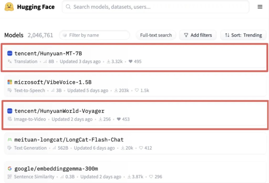 当然,腾讯也在积极布局开源。上月初开源的混元翻译模型 Hunyuan-MT-7B 以及最新的世界模型 HunyuanWorld-Voyager 一度在 Hugging Face 模型趋势榜单前三中占据两席。