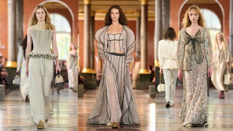 Louis Vuitton 2026春夏女装的惊艳,藏于细节工艺:钉珠、蕾丝、流苏、蝴蝶结、刺绣亮片与金属质感材质交织,如卢浮爆建筑般精致,沉淀出厚重历史感。本季打破过往华丽厚重,以“轻与软”重构奢华,轻柔罗纱、丝绸搭配羊羔毛,兼具古典肖像画的温柔与现代居家的柔和触感,传递自洽松弛的生活态度。而色彩则以“夏季寓所”为灵感,从裸色、浅粉、米白过渡到浓烈印花与醇厚黑色,平衡中性色与对比色;设计内核强调 “为自己着装”,以真实个性为奢侈本质。在廓形上,Nicolas Ghesquière转向松弛飘逸风格,宽松剪裁中保留精致感。阔腿长裤、褶皱层叠单品、造型感毛衣与衬衫,兼顾舒适随性与高级格调,勾勒出力量与柔美并存的女性形象。