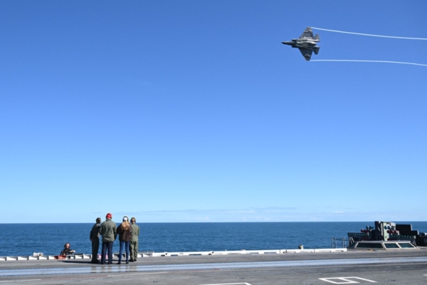川普夫妇站在航母甲板上观看了一场军事演习。海军驱逐舰向大西洋发射了导弹和炮弹,海豹部队队员从直升机上空降,战斗机从航母上弹射起飞。