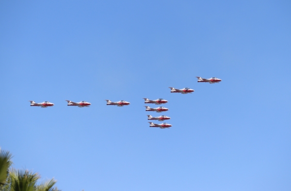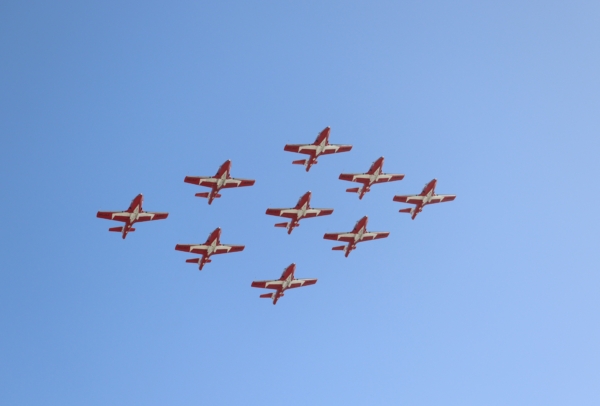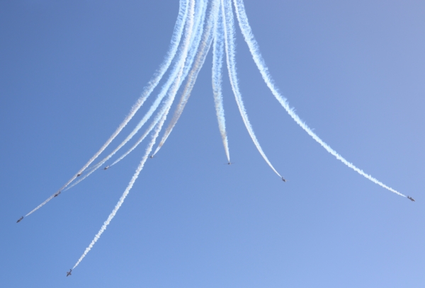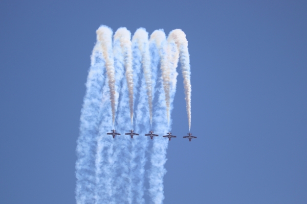 2025年10月3日,第九届太平洋航展(Pacific Airshow)在南加州杭廷顿海滩市举办,来自美、加、德、法、英、澳等六国的代表队参加了表演。图为加拿大空军雪鸟飞行表演队(Canadian Forces Snowbirds)的5架飞机。(李梅/大纪元) 2025年10月3日,第九届太平洋航展(Pacific Airshow)在南加州杭廷顿海滩市举办,来自美、加、德、法、英、澳等六国的代表队参加了表演。图为加拿大空军雪鸟飞行表演队(Canadian Forces Snowbirds)的9架飞机。(李梅/大纪元) 此外,还有包括来自法国和澳大利亚的民事飞行表演,如黎明编队飞行表演(Dawn Patrol RV Formation Demo)、红牛空军(Red Bull Air Force)特技表演,以及无畏航展队(Undauted Airshow)等,都给观众带来惊喜。在所有飞行表演前,洛杉矶消防局第20号消防船(Fireboat 20)从海上渐渐靠近海岸,喷出数条高大水柱,提示飞行表演将正式开始。