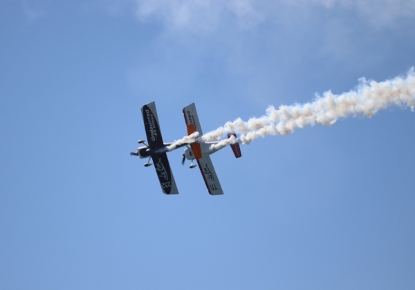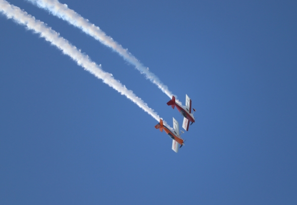 2025年10月3日,第九届太平洋航展(Pacific Airshow)在南加州杭廷顿海滩市举办,来自美、加、德、法、英、澳等六国的代表队参加了表演。图为2架红白和橙白色的无畏航展(Undauted Airshow)队的飞机。(李梅/大纪元) 2025年10月3日,第九届太平洋航展(Pacific Airshow)在南加州杭廷顿海滩市举办,来自美、加、德、法、英、澳等六国的代表队参加了表演。图为2架红白和橙白色的无畏航展(Undauted Airshow)队的飞机。(李梅/大纪元) 2025年10月3日,第九届太平洋航展(Pacific Airshow)在南加州杭廷顿海滩市举办,来自美、加、德、法、英、澳等六国的代表队参加了表演。图为王牌航空(Ace Maker Aviation)创始人格雷戈里‧科利尔(Gregory “Wired” Colyer)驾驶的T-33“流星”(T-33 Shooting Star)。(李梅/大纪元) 军事表演队包括美国空军雷鸟队(Thunderbirds)、海军陆战队MV-22“鱼鹰”演示队(MV-22 Osprey Demo)、海军跳蛙跳伞队(Leap Frogs Parachute Team)、北美防空司令部拦截演示队(NORAD Interdiction Demo)、英国王家空军猎鹰跳伞队(Falcons Parachute Display Team),以及加拿大空军雪鸟队(Snowbirds),他们在蔚蓝色的海天之间翻腾回旋。