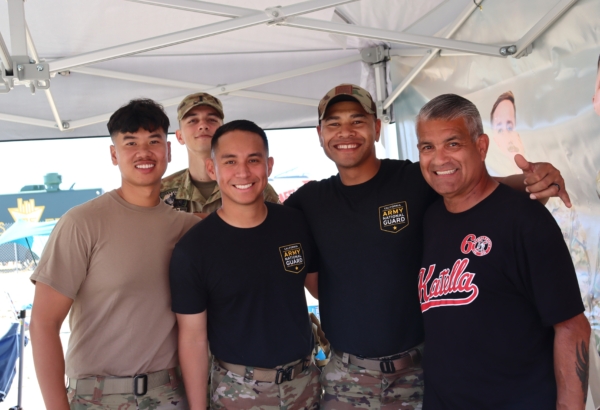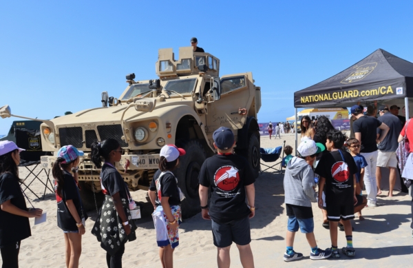 2025年10月3日,第九届太平洋航展(Pacific Airshow)在南加州杭廷顿海滩市举办。图为NXTGN STEM LAB主题区,安纳罕市卡特拉高中(Katella High School)初级预备役军官训练团老师、退役军士长丹‧加斯特勒姆(Dan Gastelum,右一)和国民警卫队员合影。(李梅/大纪元) 谈及自己的经历,加斯特勒姆说,他在陆军服役二十多年,在军队完成了副学士、学士和硕士学位,军队支付了教育费用;女儿也在陆军服役四年,军队也会支付她的上学费用。国民警卫队一级军士长莫里斯‧科利尔(Maurice Collier)介绍了向学生展示的包括飞行员项目、工程师项目、车辆机械师等。他说,部队的教育、医疗保健埃利都很好,欢迎加入。