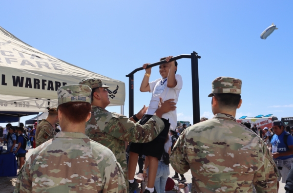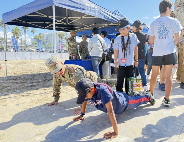 2025年10月3日,第九届太平洋航展(Pacific Airshow)在南加州杭廷顿海滩市举办。图为NXTGN STEM LAB主题区,一名小学生在尝试臂力,引体向上;右上角为固特异飞艇(Goodyear Blimp),100年前的1925年6月,固特异飞艇首次在俄亥俄州阿克伦(Akron)飞行。(李梅/大纪元) 2025年10月3日,第九届太平洋航展(Pacific Airshow)在南加州杭廷顿海滩市举办。图为NXTGN STEM LAB主题区,一名小学生在和军人一起做俯卧撑。(李梅/大纪元) 2025年10月3日,第九届太平洋航展(Pacific Airshow)在南加州杭廷顿海滩市举办。图为NXTGN STEM LAB主题区的一队小学生,背景是防爆巡逻车马特‧V(Matt V)。(李梅/大纪元) 安纳罕市卡特拉高中(Katella High School)的初级预备役军官训练团老师、退役军士长丹‧加斯特勒姆(Dan Gastelum)介绍,该校和陆军有“后备军官训练”(ROTC)合作项目,而同学区的安纳罕高中和海军也有合作项目;卡特拉高中是第一次组织学生来航展,“我还带来了非后备军官训练队的学生,让他们增长见识,学习领导力;如果不上大学,他们仍然有很多的选择”。