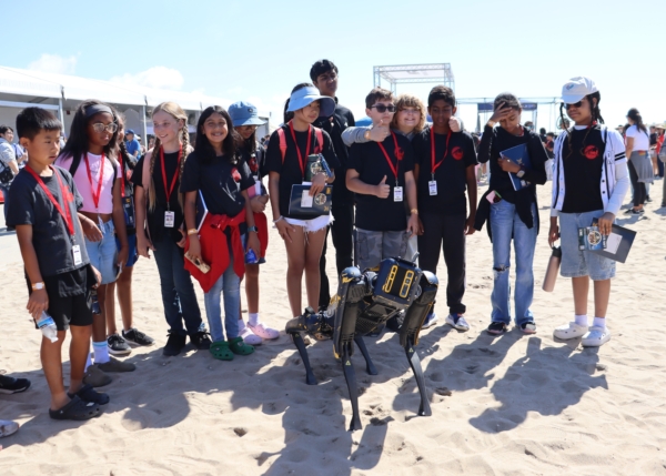 在NXTGN STEM LAB主题区的沙滩上,来自安纳罕市(Anaheim)特维拉‧里德小学(Twila Reid Elementary School)的60名三年级学生由老师金‧斯瓦那伯格(Kim Swanenberg)带队参加。他说:“这是孩子们的第一次校外实地考察活动,他们非常兴奋,很喜欢看机器狗和无人机,也许这些将成为孩子们未来的梦想职业。”