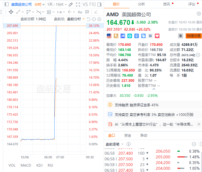 受此消息提振,AMD股价在盘前交易中应声暴涨,一度飙升超26%,股价触及207美元的高位。与此同时,作为当前AI芯片市场的主导者,英伟达的股价在盘前交易中下跌了1%。