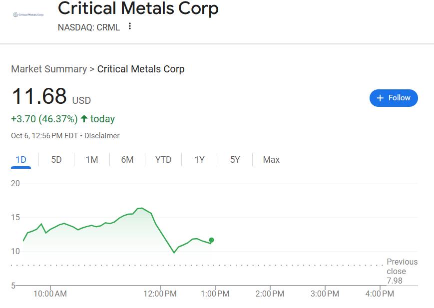美东时间10月6日周一,白宫官员否认的消息传出后,早盘涨幅曾达109%的Critical Metals(CRML)股价涨幅迅速收窄,盘中涨幅一度不足15%,因股价波动大曾暂停交易,午盘之初涨超40%。评论称,川普政府考虑持股的消息,叠加Critical Metals宣布获得新的机构投资者,共同推动该司股价周一暴涨。