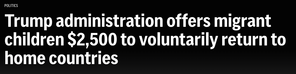 川普政府上周五(10月3日)宣布了一项新的激励措施,计划向每位未成年移民支付2500美元,鼓励他们自愿返回原籍国,借此推动更多人选择自行离境。