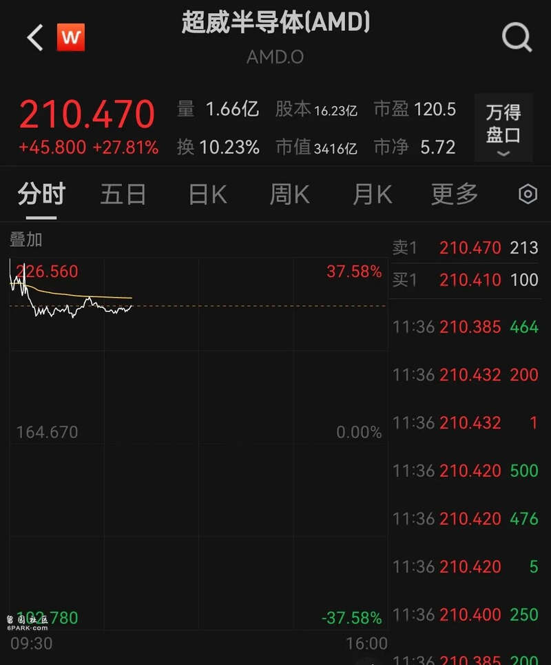 截至发稿,AMD股价报210.47美元/股,涨27.81%,市值约为3416亿美元。