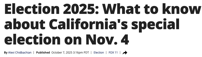 本次特别选举仅涉及一项提案——第50号提案(Proposition 50),其目的是临时调整加州国会选区边界,以增加民主党在联邦众议院的席位数。加州州长加文·纽森(Gavin Newsom)表示,这一提案旨在对抗德克萨斯州通过类似操作增加的共和党席位。