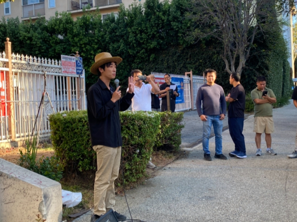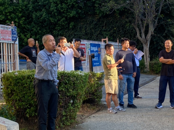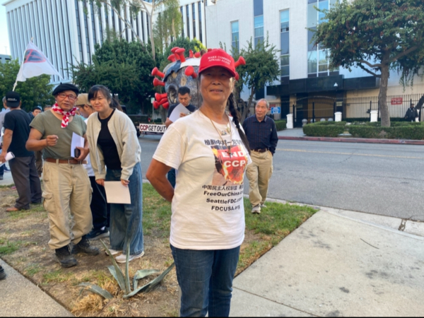 拄着拐杖的中国民主联盟主席金秀红,在集会上用英语发言。她说,中共不但在国内抓捕异议人士、抓捕维权律师,还把镇压延伸到美国;只要中共存在,“即使身在美国,我们也并不安全”。她带领集会者一起呼喊“结束中共!”等口号。