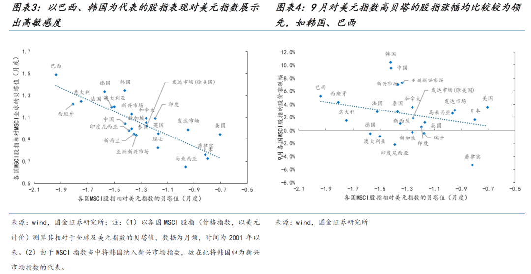 实际上,对全球经济周期和美元指数高度敏感(以股指对美元指数的贝塔值进行衡量)的国家/地区在9月实现更高的股价涨幅,典型的以巴西和韩国为代表的国家因获得AI扩散和有色金属矿业两大逻辑的分别加持而明显跑赢。