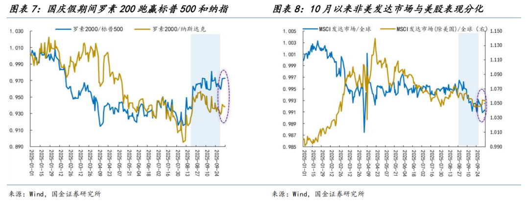 ②发达市场(除美国)开始跑赢美股,这意味着美国作为本次宏观风险事件(政府关门)的核心区域,投资者可能更加青睐于美国以外的市场,迭加日本高市早苗或将成为日本首位女首相带动日本股市上涨,反而使得国庆期间美股并未跑赢美国以外的发达市场。