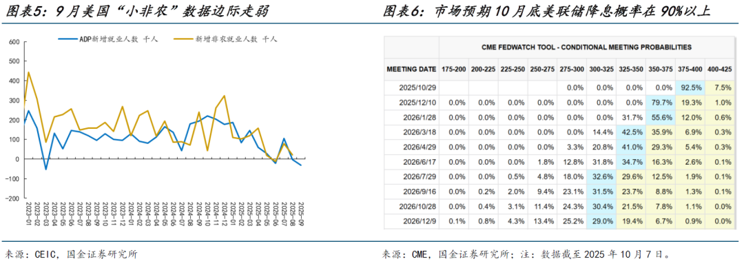 背后逻辑在于:市场倾向于认为本次美国政府关门导致经济冲击或偏短期;与此同时,关键经济数据的“缺席”导致市场包多依赖私营部门的数据,而“小非农”数据的走软显示当下美国就业市场下行风险的上升,市场对10月底美联储采取连续降息25BP仍持乐观定价,且经济“软着陆”依然是基准情形。