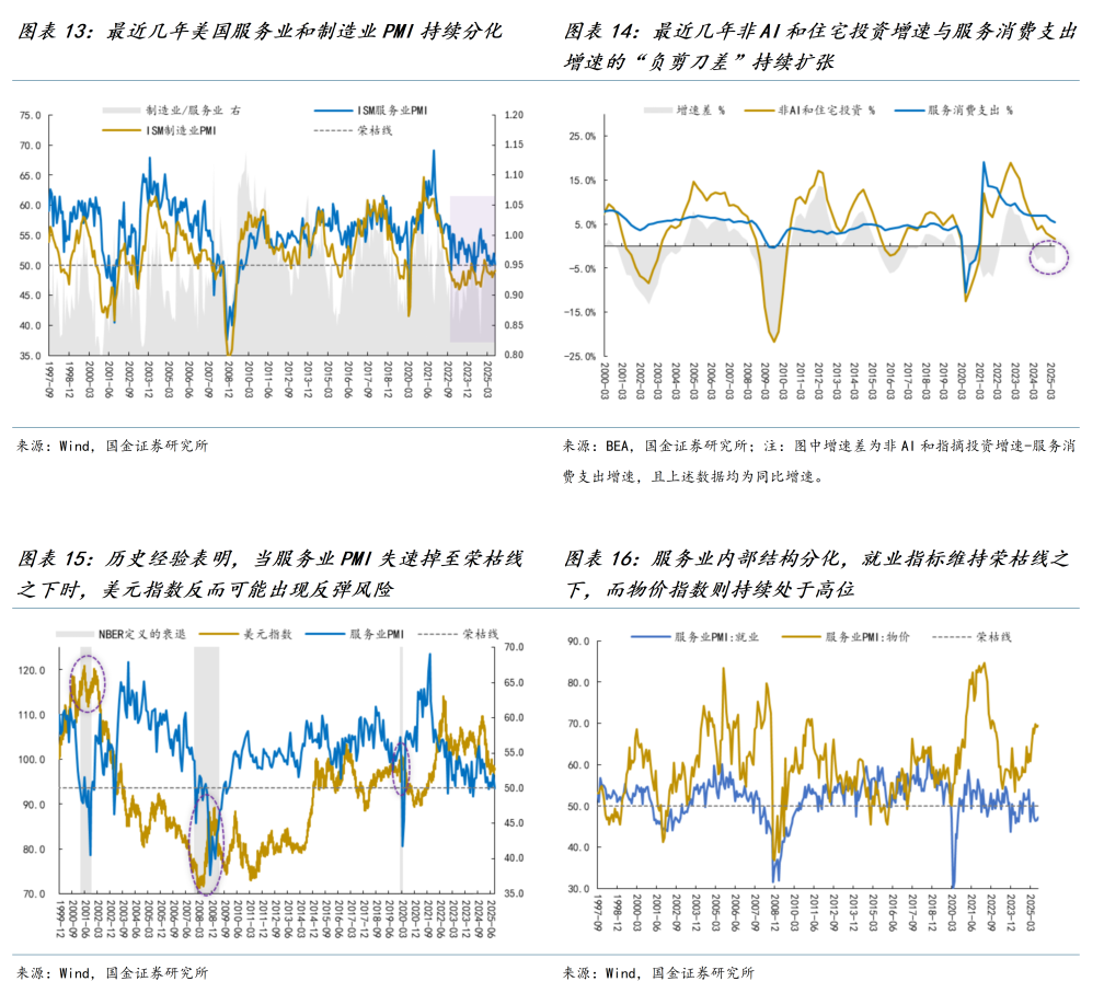 事实上,拆分美国GDP分项来看,尽管服务消费支出增速有所回落,但实际上仍明显高于剔除AI和住宅后的投资增速,且两者之间的“负剪刀差”(非AI和住宅投资增速-服务消费支出增速)仍在低位。而当下美国服务业和制造业的分化也使得未来两者不同的演绎路径可能导致美国经济可能走向不同的方向,或将成为未来美元指数走弱的逆风因素。对于投资者而言,更为重要的是在美元做空预期一致的情形下关注“弱美元”交易叙事出现转变的可能性。