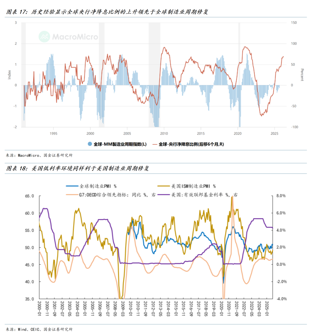 路径二:如果是制造业指示未来美国经济的方向:尽管就业增长放缓及服务业需求下滑(但并未出现失速下滑),但高利率压力的缓解或将刺激制造业需求,美国经济进入“金发姑娘”式软着陆情景。从历史经验来看,以“全球央行净降息比例”(采用全球“降息比例”的央行减去“加息比例”的央行)衡量全球流动性的宽松程度,该指标往往领先于全球制造业周期的修复,意味着随着全球央行降息周期的开启,此前高利率环境下被压制的需求有望逐步得以释放。