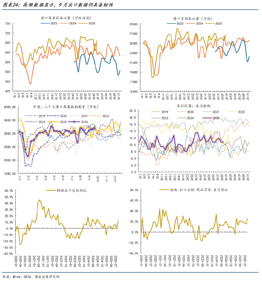 但未来可能出现的演绎路径是:美国制造业复苏与全球制造业回暖→出口订单回暖→需求修复且国内“反内卷”继续执行→价格企稳并带动企业盈利修复。事实上,从制造业PMI分项来看,外需韧性仍是当下制造业的主要支撑,体现为新出口订单和小型企业环比回升幅度较大;与此同时,高频数据显示,9月以来出口仍具备韧性。