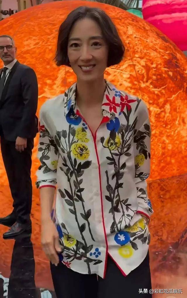 41岁桂纶镁中性打扮,一身中式衬衫加阔腿裤,瘦到超模身材,皮肤白皙短发烫了一下,状态还不如普通人。