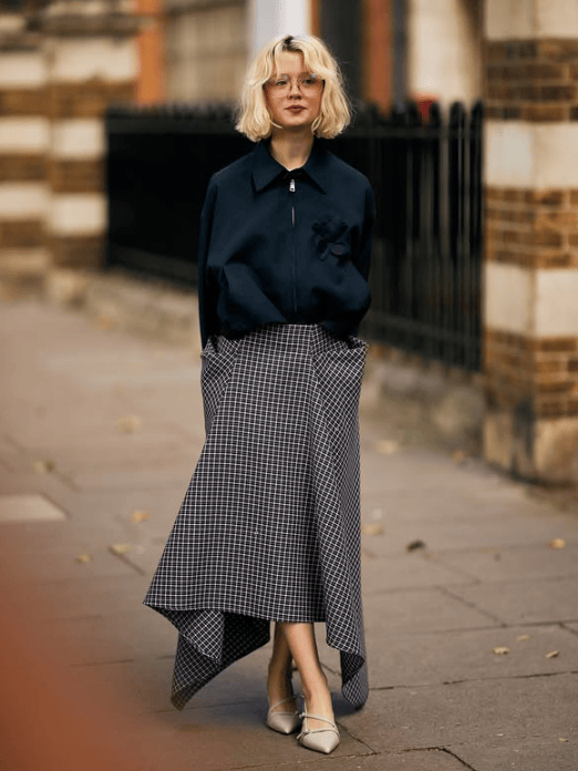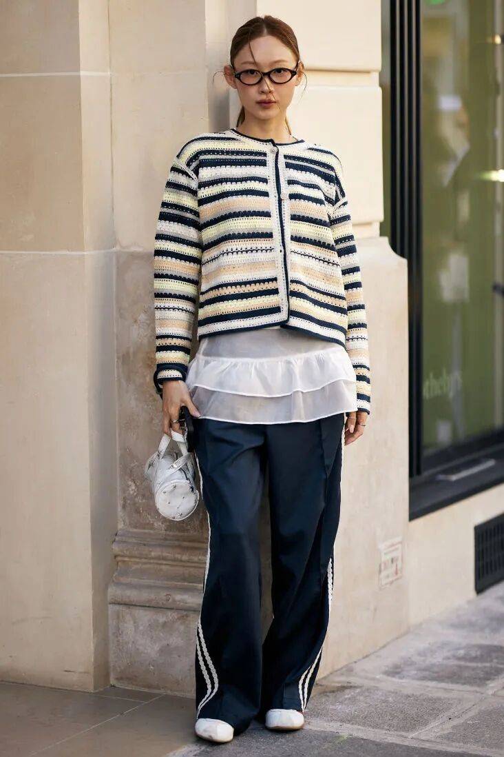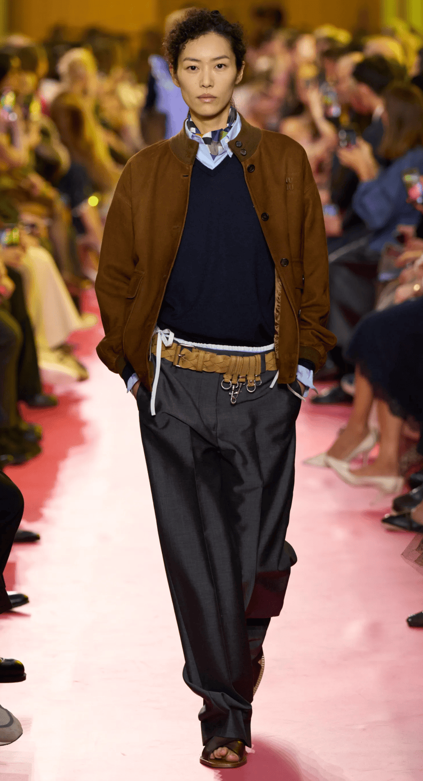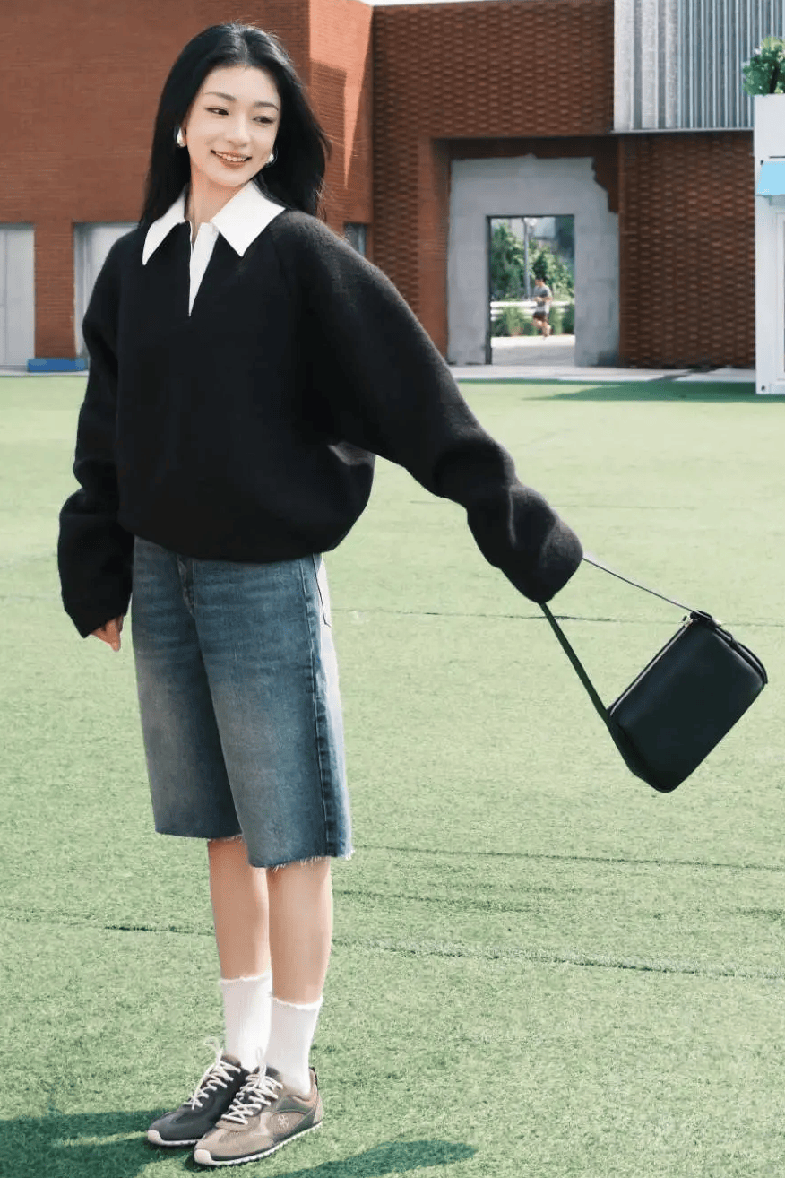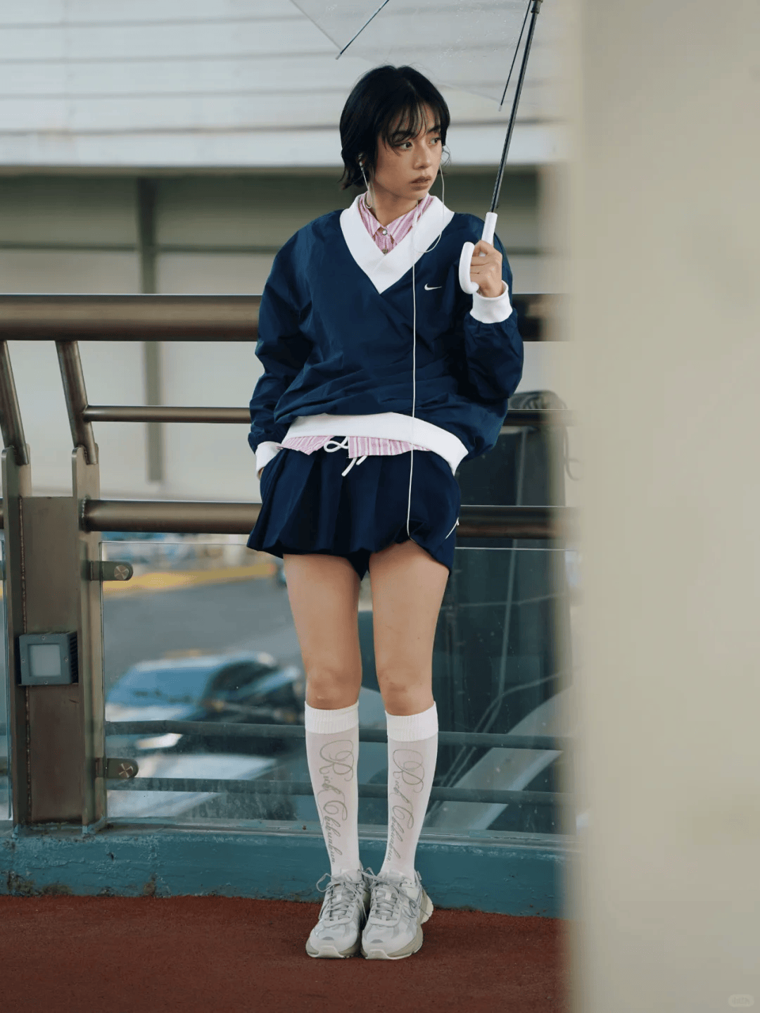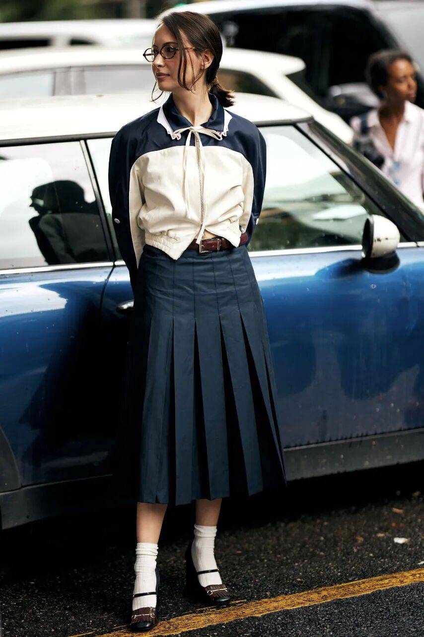 短款夹克更显利落线条,也让下装的复古感更加丰富,搭配百褶裙、格纹半裙或套装裤,在都市通勤与运动中巧妙切换。