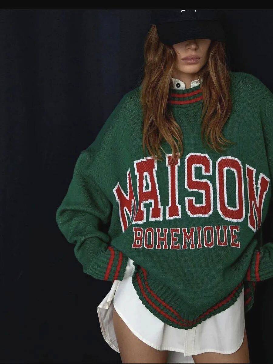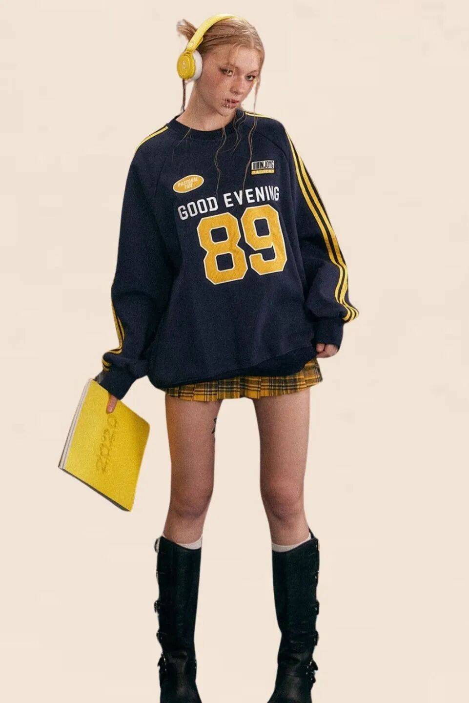 例如,一件亮黄色的运动夹克,或一件复古红色的字母卫衣。