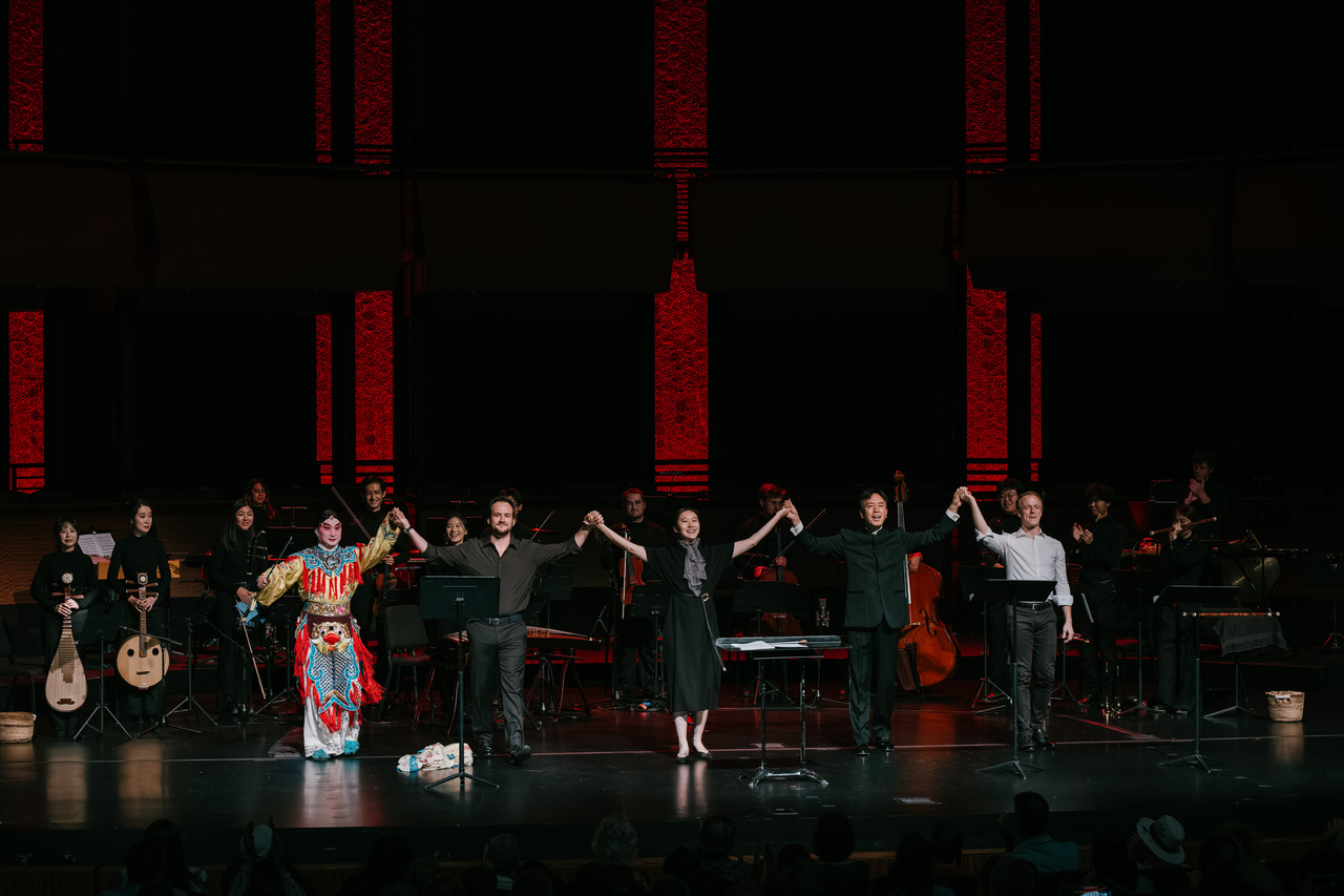 第八届纽约中国当代音乐节在林肯爵士乐中心演奏多支由华裔当代音乐创作者带来的、以中西合璧为特点的作品。图为融合了西洋歌剧和中式京剧的室内歌剧“谜”落幕谢场。(主办方提供)